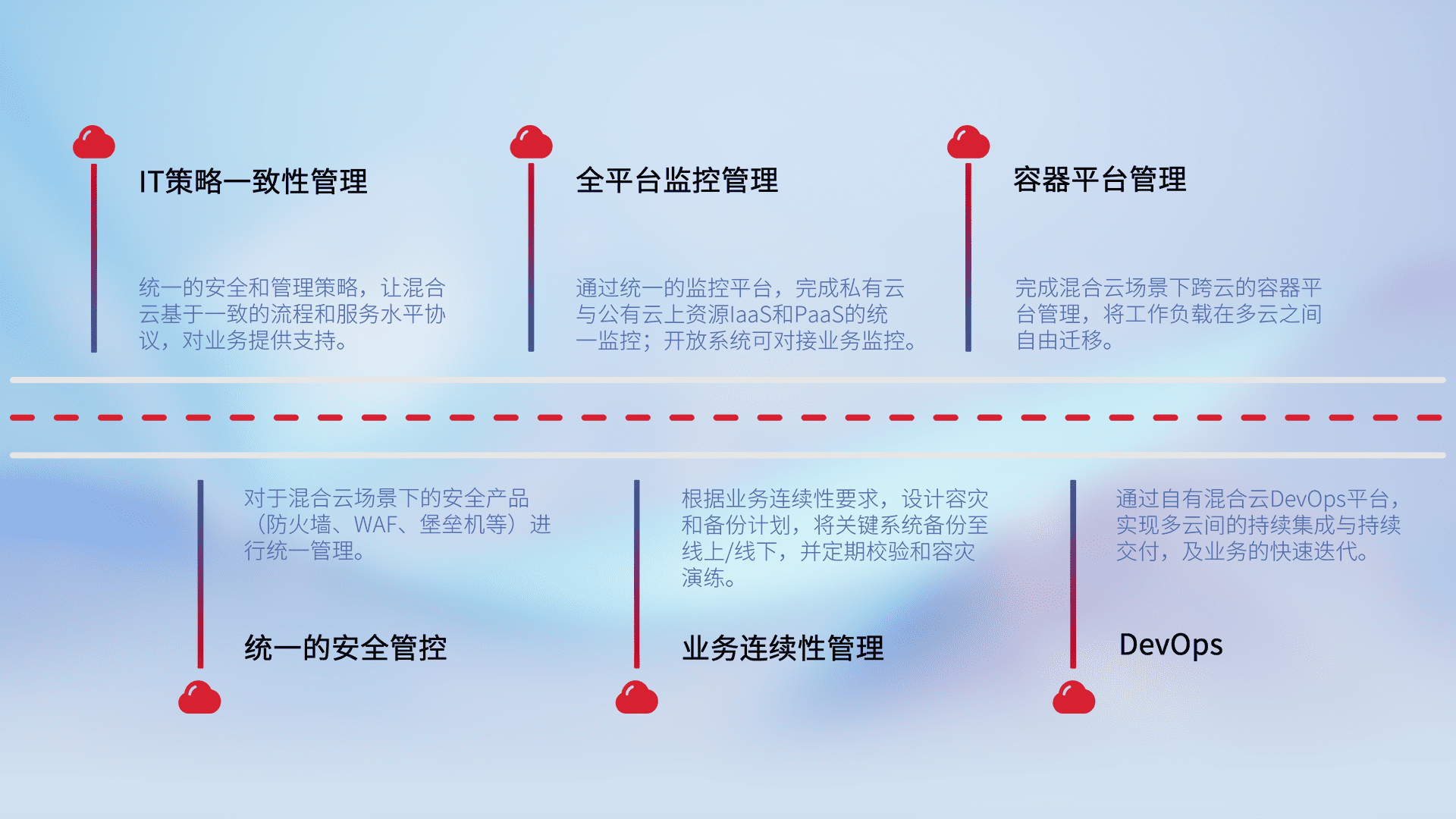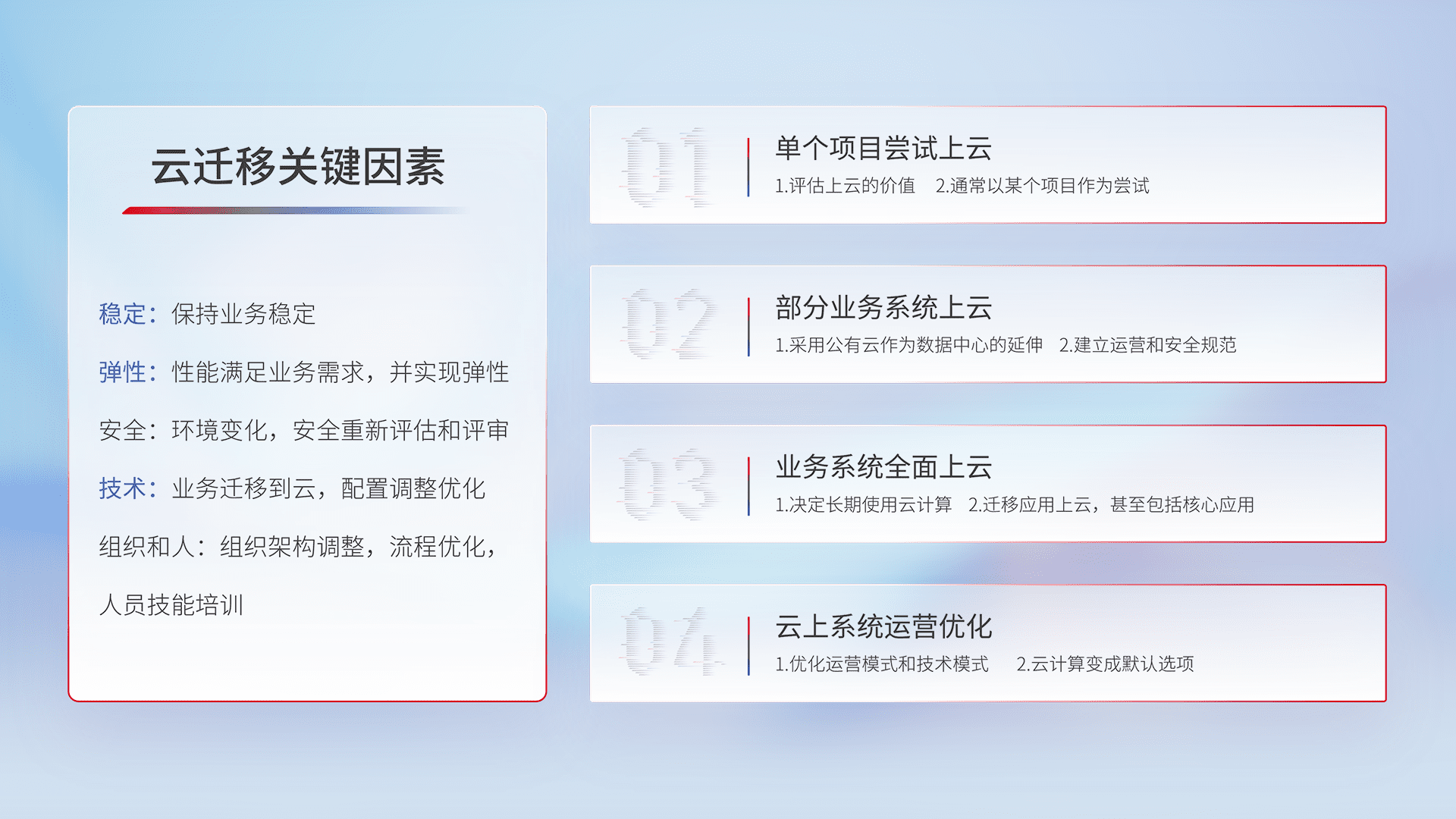 结合实际业务,,,,从规划设计、、云平台选型、、、、云原生改造、、、数据迁移、、、、集成交付,,,迁移全过程为客户识别最佳上云路径,,,,做好风险识别管理,,,设计网络架构、、身份权限、、、、安全审计合规、、操作审计、、日志审计、、、监控告警策略、、、多站点容灾设计等,,对云上基础设施进行整体规划,,提升IT治理水平,,,以满足弹性、、高可用、、、、高性能的需求。。